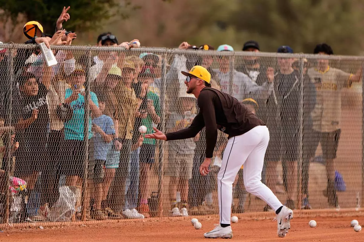 San Diego Padres center fielder Jackson Merrill tosses a ball to fans during spring training baseball practice Monday, Feb. 16, 2026, in Peoria, Ariz. (AP Photo/Charlie Riedel)