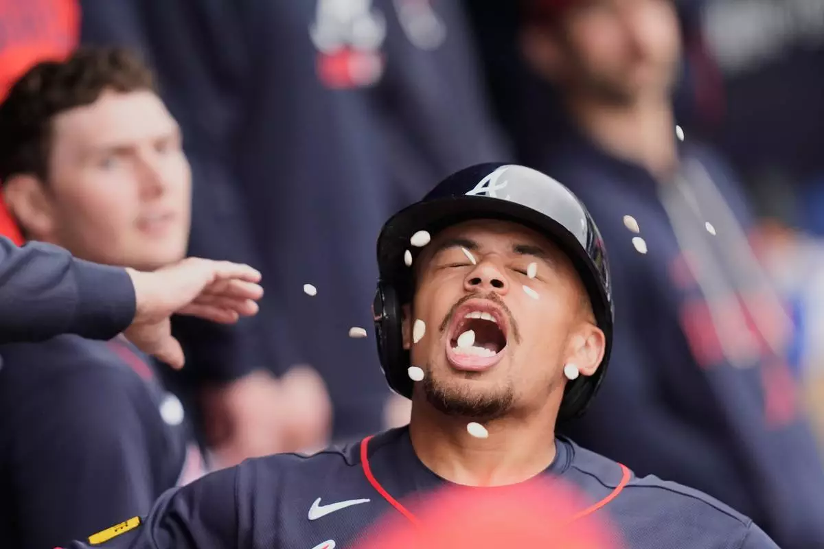 Atlanta Braves Drake Baldwin tries to catch pumpkin seeds as he is greeted in the dugout after hitting a solo home run in the third inning of a spring training baseball game against the Minnesota Twins in North Port, Fla., Sunday, Feb. 22, 2026. (AP Photo/Gerald Herbert)