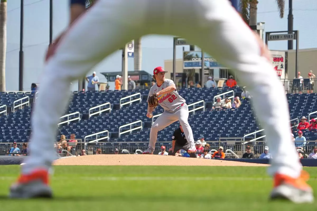 St. Louis Cardinals starting pitcher Kyle Leahy throws during the first inning of a spring training baseball game against the Houston Astros Sunday, Feb. 22, 2026, in West Palm Beach, Fla. (AP Photo/Jeff Roberson)
