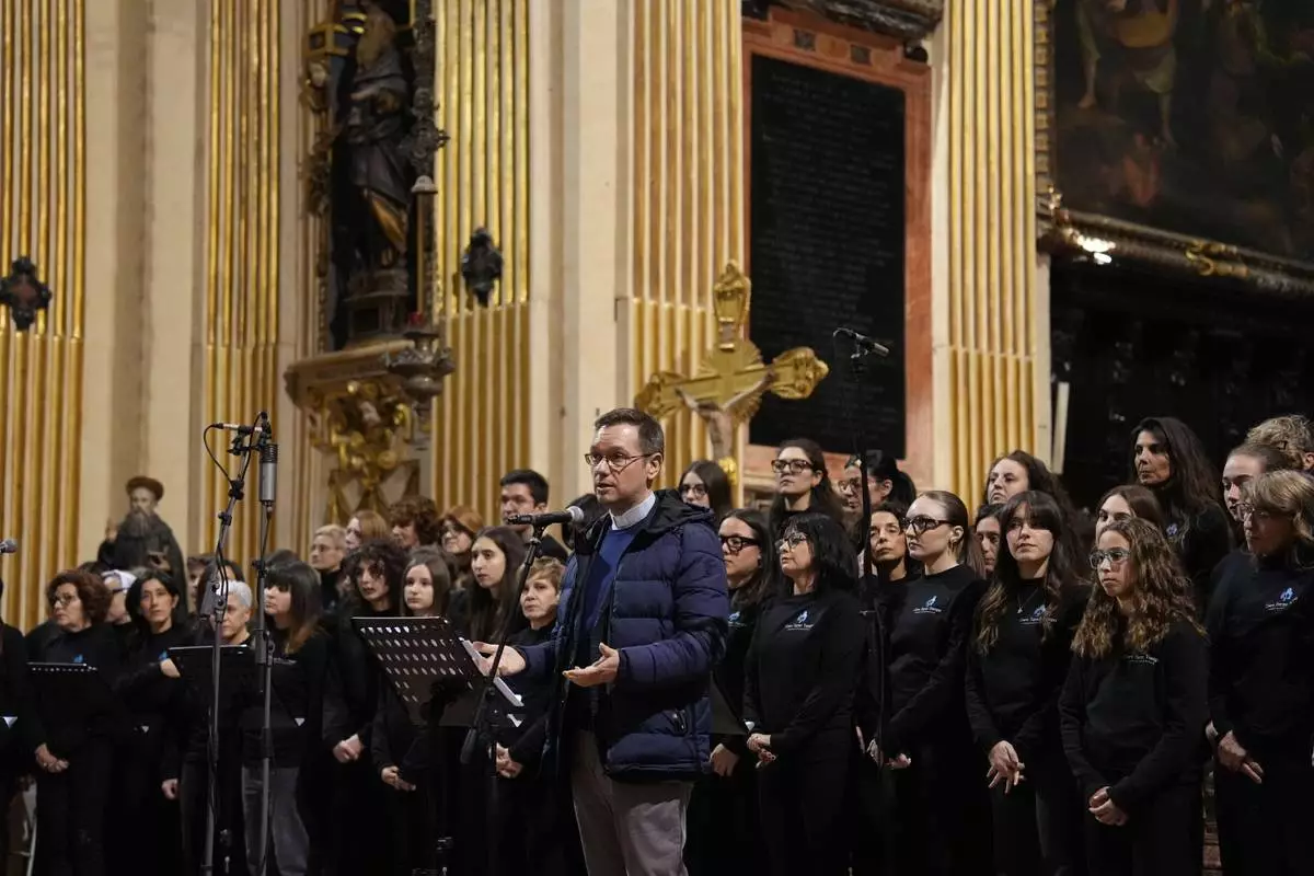 The Rev. Stefano Guidi, head of the Archdiocese of Milan’s Service for Oratories and Sport, addresses attendees during a concert at the church of Sant’Antonio Abate in Milan, Italy, on Feb. 18, 2026. (AP Photo/María Teresa Hernández)