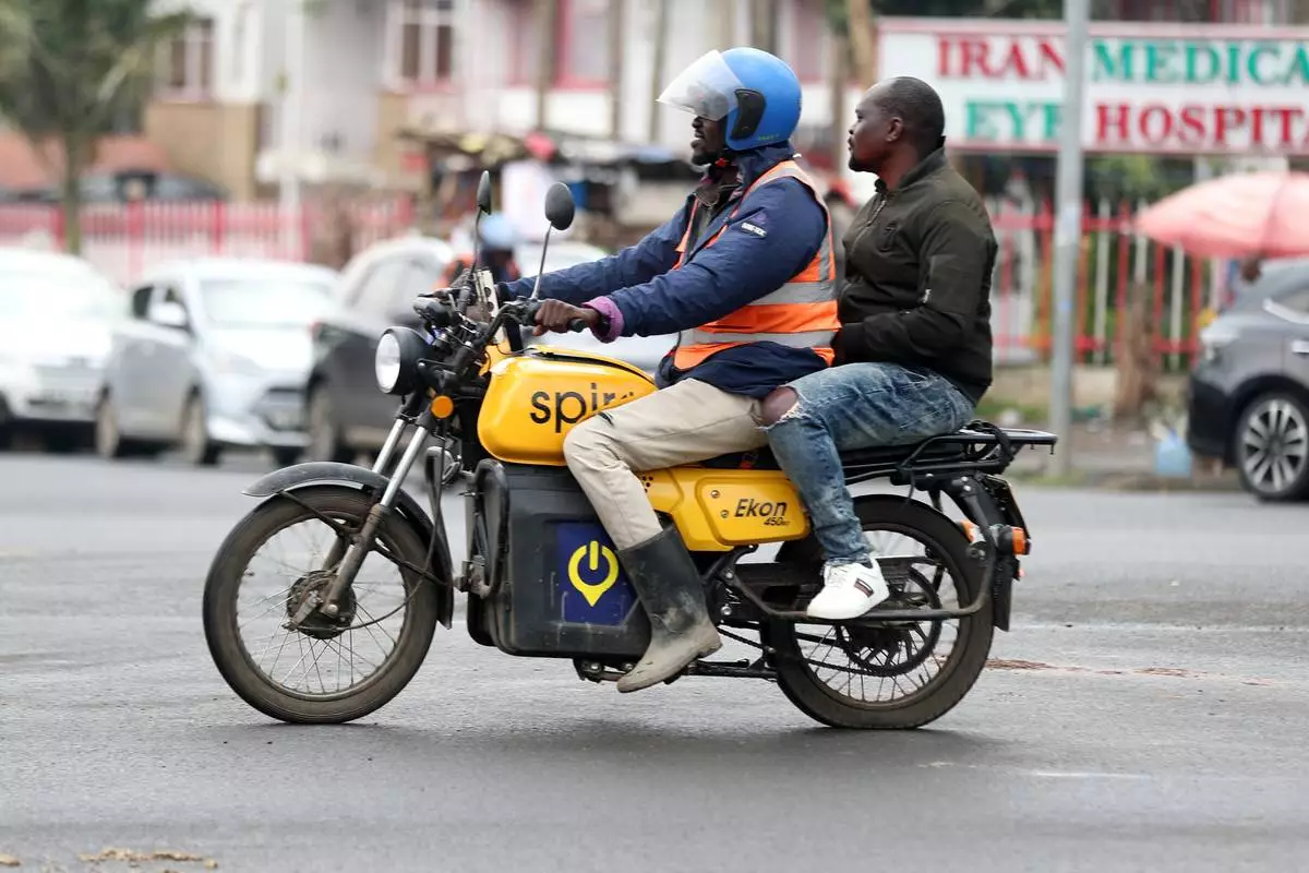 A man rides an electric Spiro motorcycle carrying a passenger in Nairobi, Kenya, Tuesday, Feb. 24, 2026. (AP Photo/Henry Naminde)