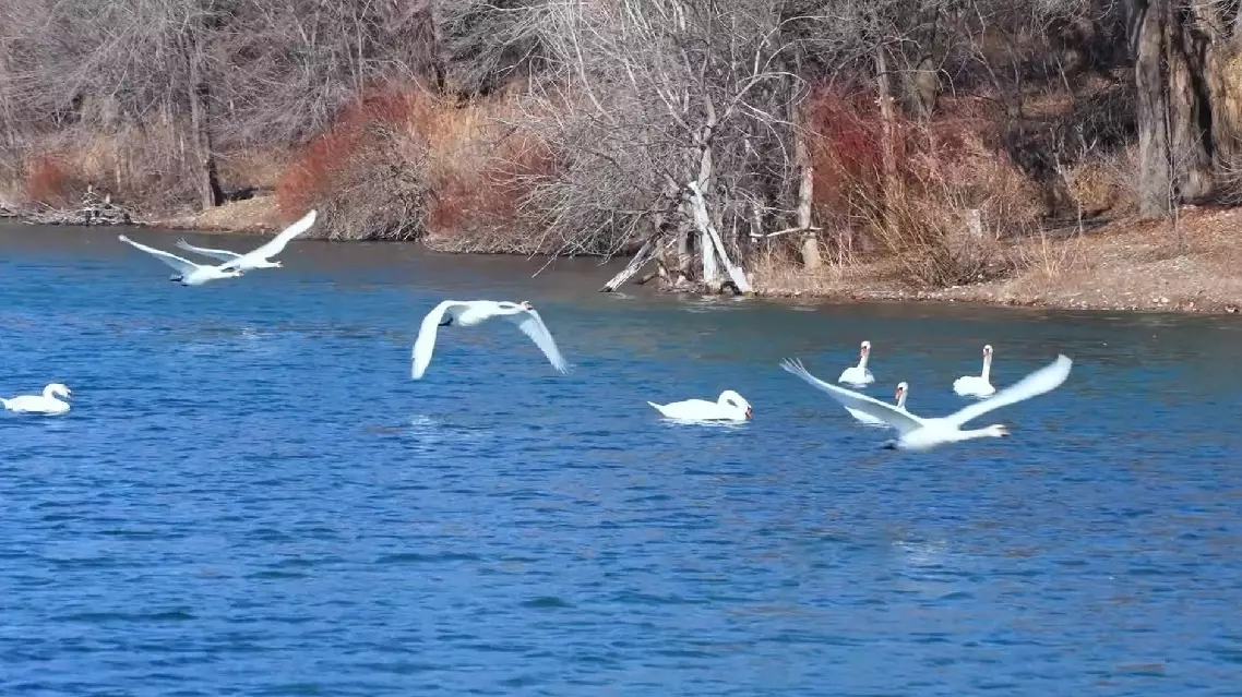 On the sapphire-blue surface of the Equan (Swan Spring) Wetland Park in the county, wintering mute swans were spotted foraging, preening their feathers, and practicing flight.