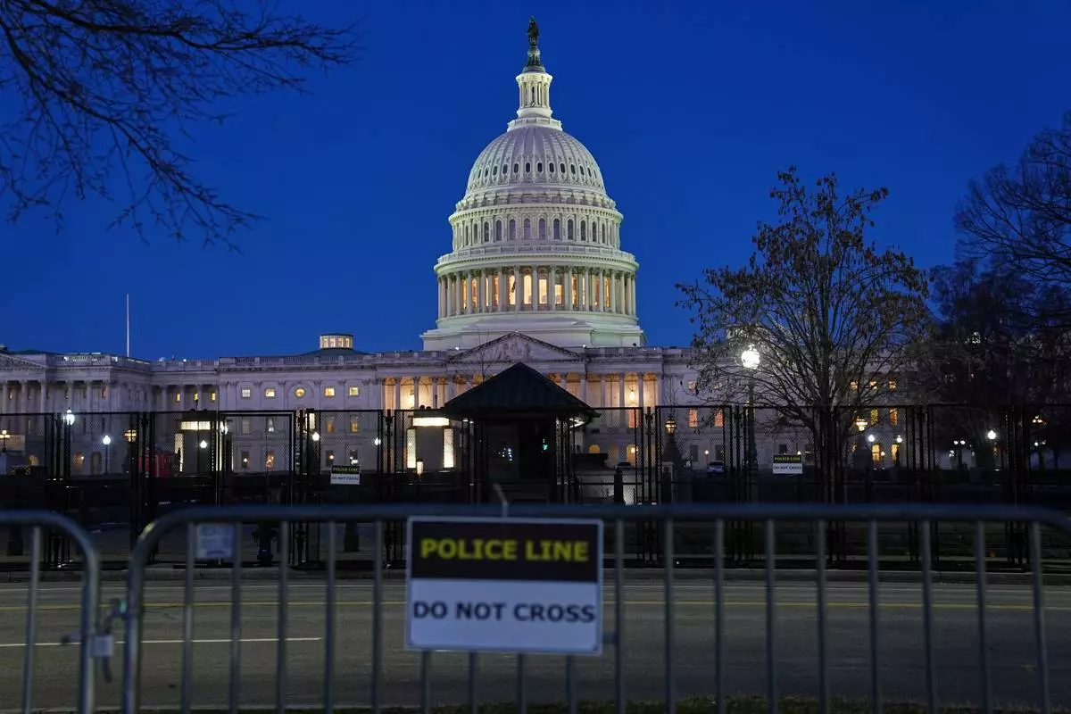 The U .S. Capitol is seen after sunset in Washington, Monday, Feb. 23, 2026, ahead of President Donald Trump's State of the Union address. (AP Photo/Matt Rourke)