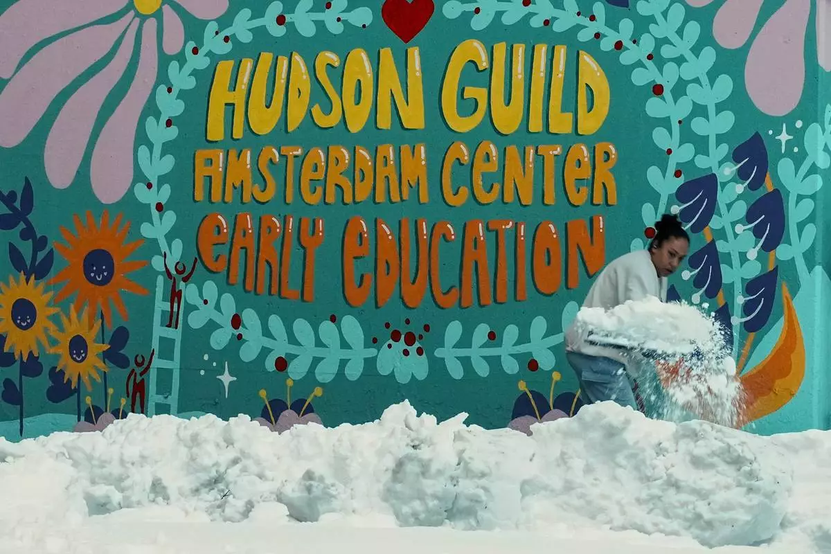 A woman clears snow from a walk outside a preschool, Tuesday, Feb. 24, 2026, in New York. (AP Photo/Eduardo Munoz Alvarez)
