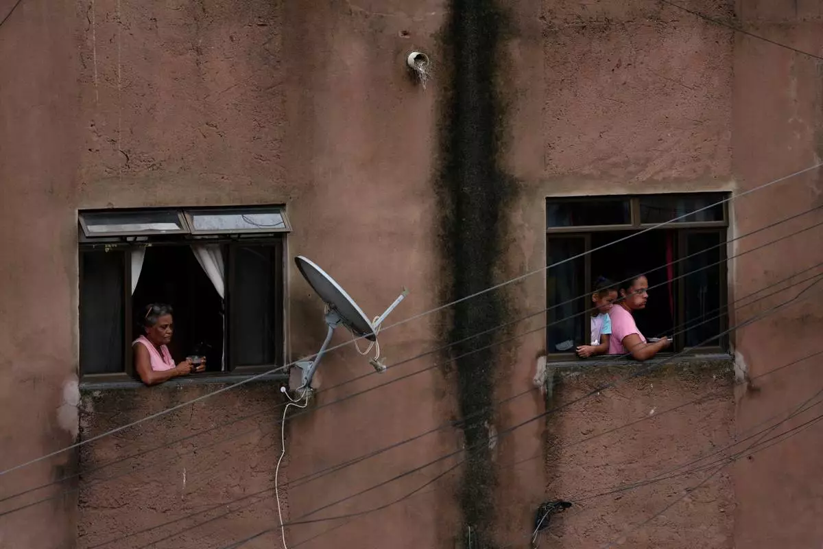 Residents watch firefighters and civil defense workers at the site of a landslide caused by heavy rains and severe flooding in the Parque Burnier neighborhood of Juiz de Fora in Minas Gerais state, Brazil, Tuesday, Feb. 24, 2026. (AP Photo/Silvia Izquierdo)