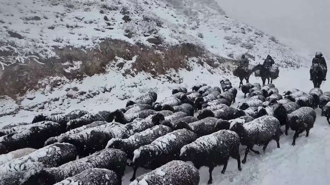 With many ewes nearing lambing, the migration requires extra care. Unexpected heavy snowfall made the trip even more challenging, forcing the group to press on through harsh weather.