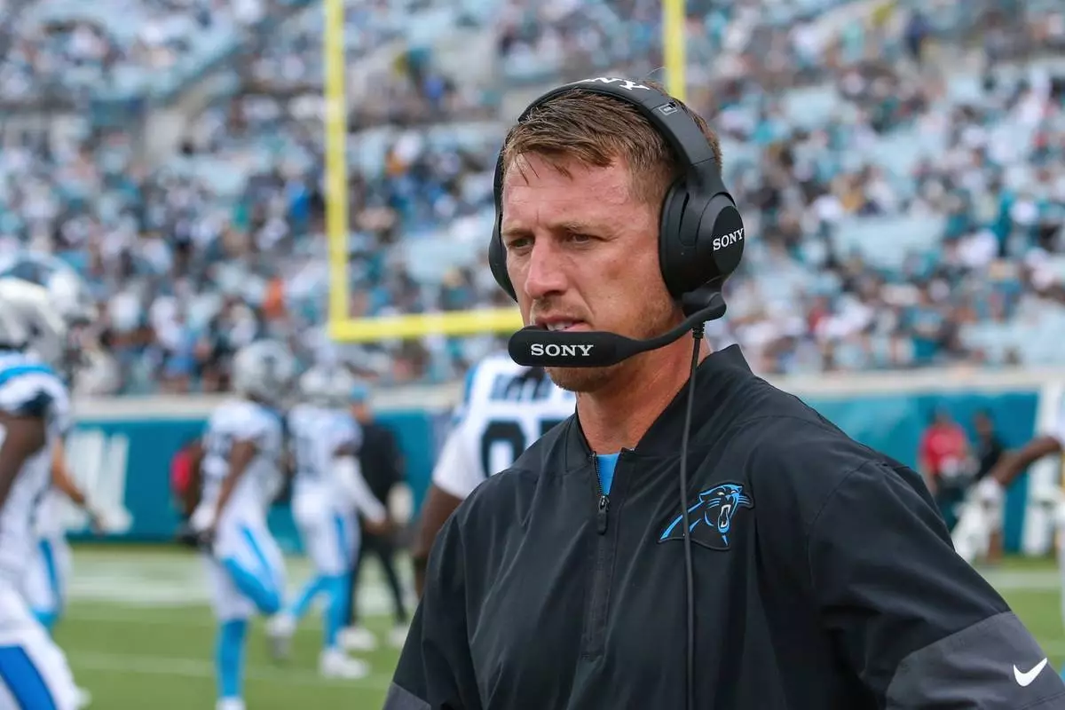 FILE - Carolina Panthers offensive coordinator Brad Idzik walks the sideline during an NFL football game against the Jacksonville Jaguars, Sept. 7, 2025, in Jacksonville, Fla. (AP Photo/Gary McCullough, File)