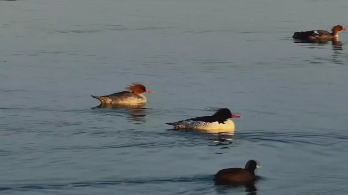On the shimmering water, several Chinese mergansers were swimming gracefully, their distinctive black crests and unique "auspicious cloud" patterns on their flanks standing out in the sunlight.