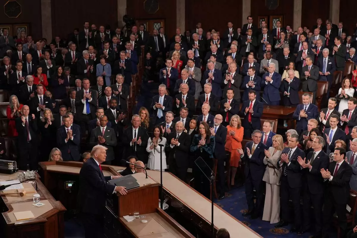 Republican members of Congress stand while Democrats keep their seats during President Donald Trump¥s State of the Union address to a joint session of Congress in the House chamber at the U.S. Capitol in Washington, Tuesday, Feb. 24, 2026. (AP Photo/Alex Brandon)