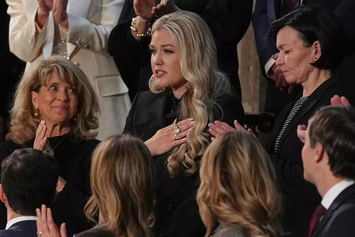 Erika Kirk gestures as President Donald Trump delivers the State of the Union address to a joint session of Congress in the House chamber at the U.S. Capitol in Washington, Tuesday, Feb. 24, 2026. (AP Photo/Matt Rourke)