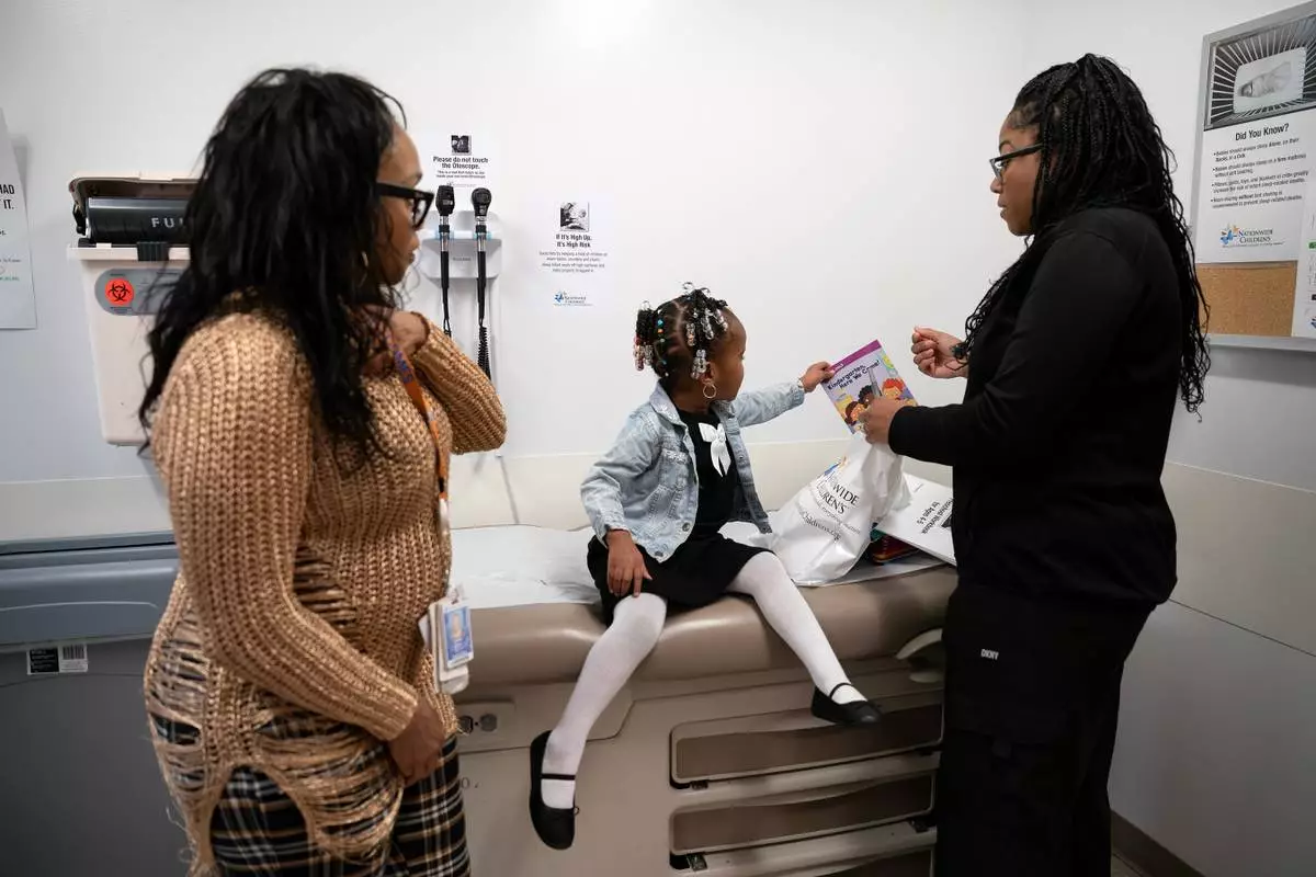 Juri Sleet, 4, picks up a book from a kit given to families at Linden Primary Care Center at Nationwide Children's Hospital, while Crystal Webb, a kindergarten readiness coordinator talks with Sleet's grandmother, Quintina Davis, about the literacy screening, Thursday, Dec. 11, 2025, in Columbus, Ohio. (AP Photo/Jessica Phelps)