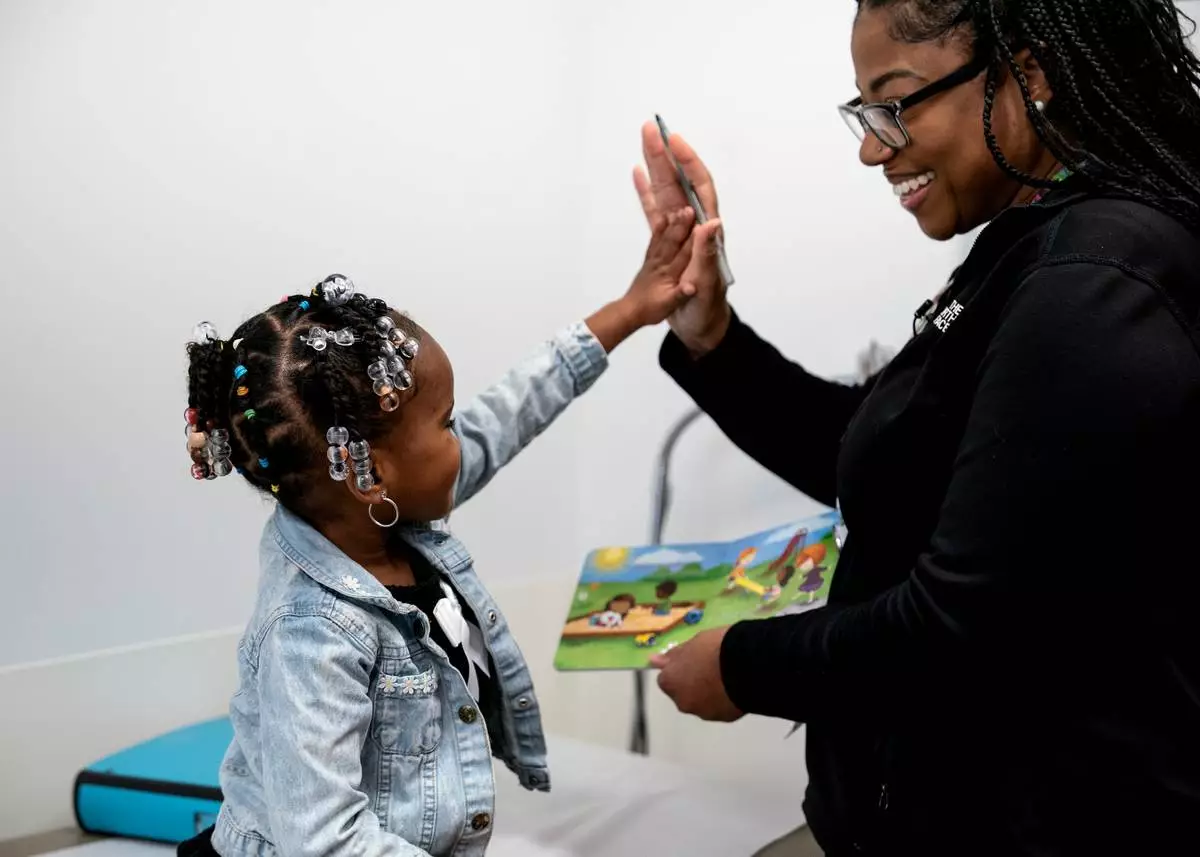 Juri Sleet, 4, works with Crystal Webb, a kindergarten readiness coordinator at Linden Primary Care Center at Nationwide Children's Hospital, Thursday, Dec. 11, 2025, in Columbus, Ohio. (AP Photo/Jessica Phelps)