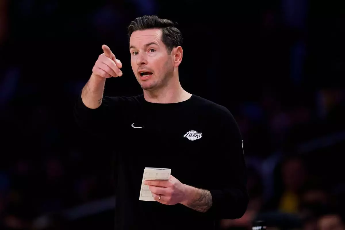 Los Angeles Lakers head coach JJ Redick gestures to players during the first half of an NBA basketball game, Tuesday, Feb. 24, 2026, in Los Angeles. (AP Photo/Caroline Brehman)
