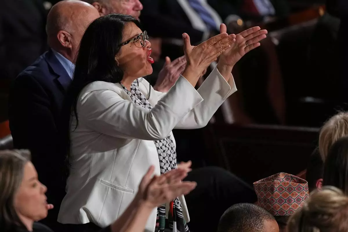 Rep. Rashida Tlaib, D-Mich., gestures as President Donald Trump delivers the State of the Union address to a joint session of Congress in the House chamber at the U.S. Capitol in Washington, Tuesday, Feb. 24, 2026. (AP Photo/Matt Rourke)