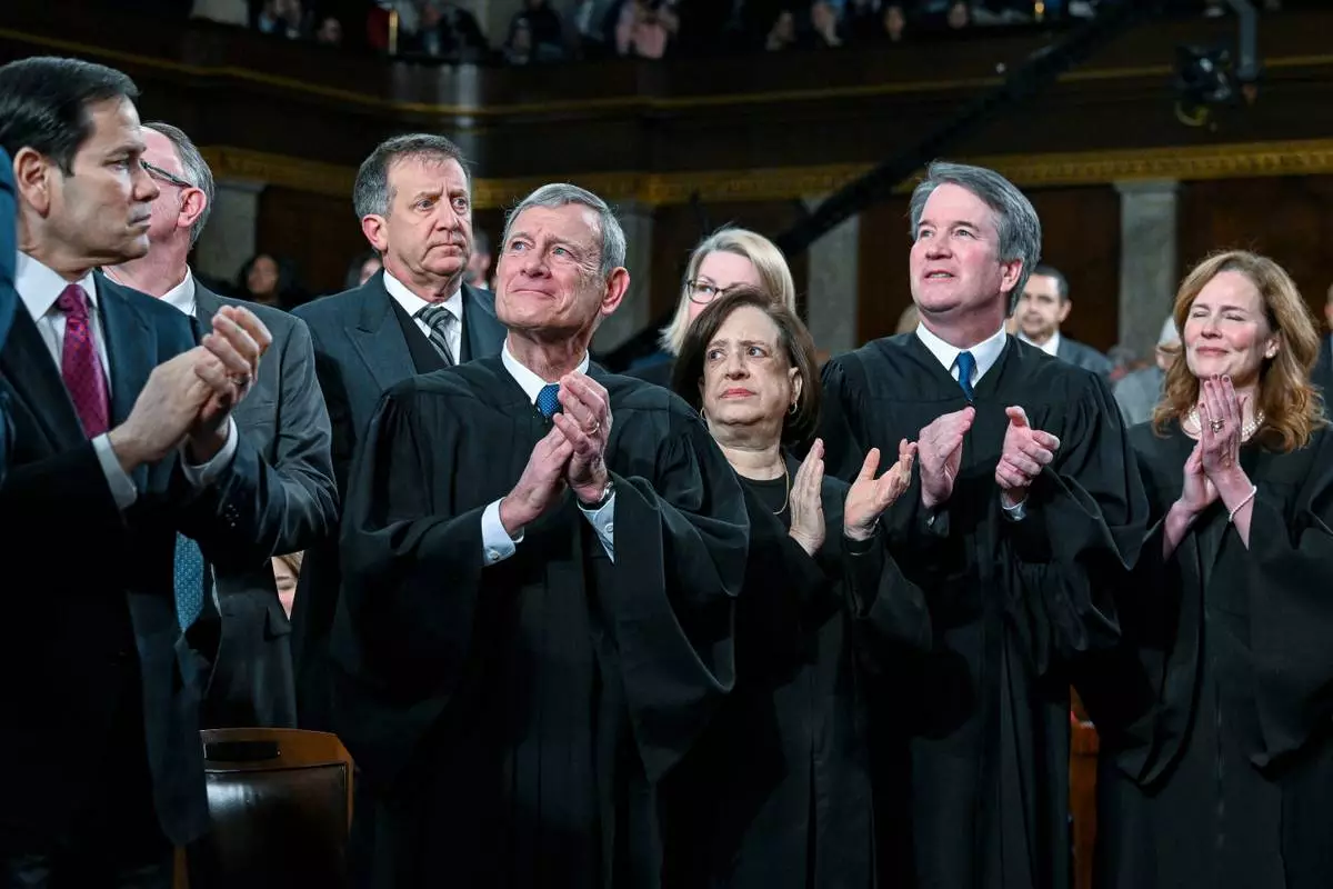 From left, Secretary of State Marco Rubio, Chief Justice John Roberts, Justice Elena Kagan, Justice Brett Kavanaugh and Justice Amy Coney Barrett, applaud before President Donald Trump delivers the State of the Union address to a joint session of Congress in the House chamber at the U.S. Capitol in Washington, Tuesday, Feb. 24, 2026. (Kenny Holston/The New York Times via AP, Pool)