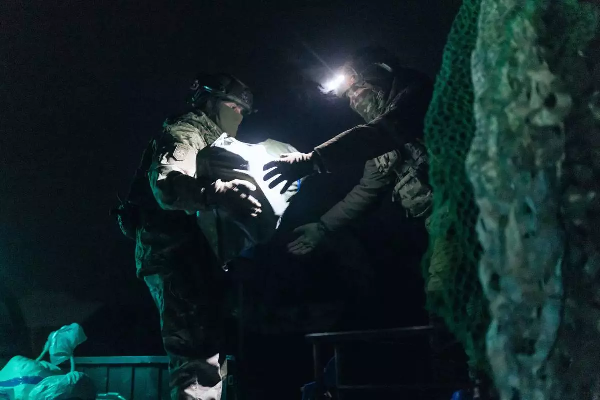 Soldiers from Ukraine's Armed Forces Khartia brigade load ammunition on a combat ground drone bound for the front line in Kharkiv region, Ukraine, Jan. 27, 2026. (AP Photo/Nikoletta Stoyanova)