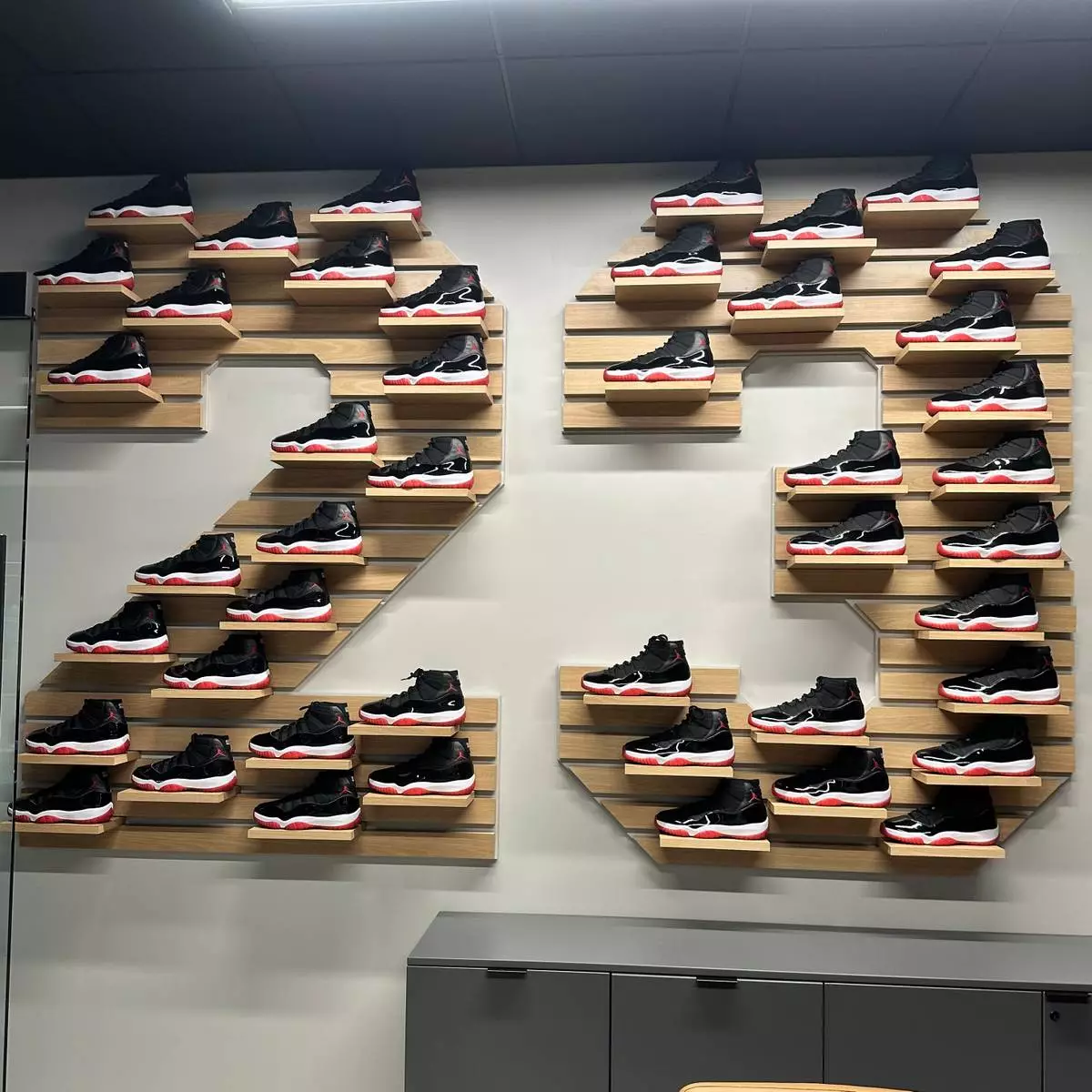 A display of 45 pairs of Nike Air Jordan 11 sneakers form the No. 23 at Airspeed, the headquarters of 23XI Racing, Tuesday, Feb. 24, 2026 in Huntersville, N.C. (AP Photo/Jenna Fryer)