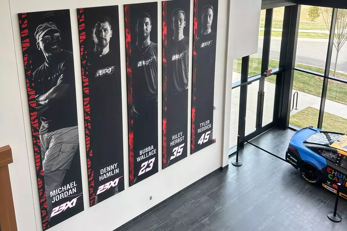 A banner, showing co-owners Michael Jordan and Denny Hamlin, as well as drivers Bubba Wallace, Corey Heim and Tyler Reddick, hangs in the lobby at Airspeed, the headquarters of 23XI Racing, Tuesday, Feb. 24, 2026 in Huntersville, N.C. (AP Photo/Jenna Fryer)
