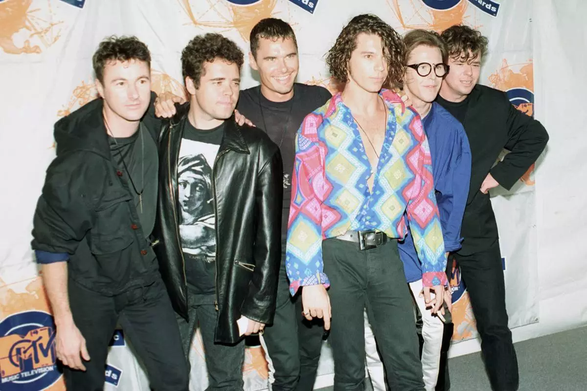 FILE - Members of the Australian rock group INXS, from left, Garry Gary Beers, Andrew Farriss, Jon Farriss, Michael Hutchence, Kirk Pengilly and Tim Farriss appear at the 7th annual American MTV Video Music Awards in Universal City, Calif., on Sept. 6, 1990. (AP Photo/Kevork Djansezian, File)