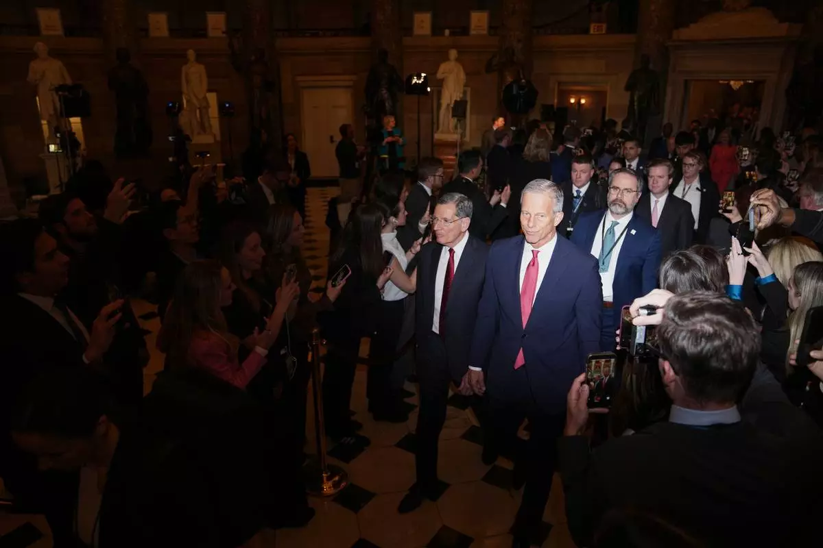 Senate Majority Leader John Thune, R-S.D., arrives before President Donald Trump delivers the State of the Union address to a joint session of Congress in the House chamber at the U.S. Capitol in Washington, Tuesday, Feb. 24, 2026. (AP Photo/Allison Robbert)