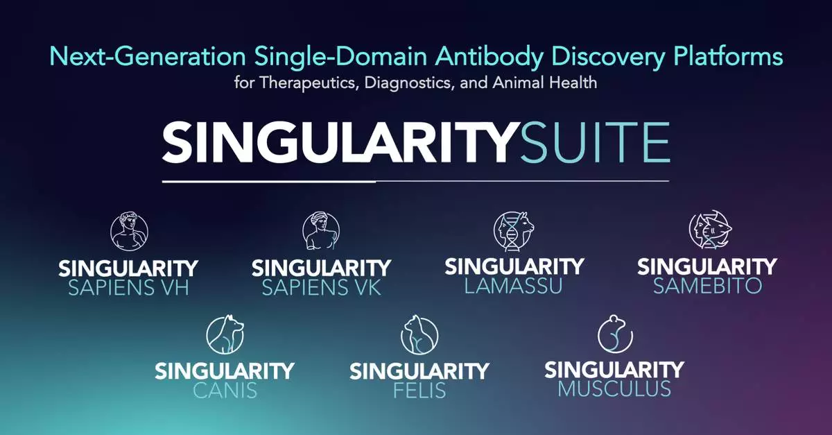 The Singularity Suite extends these system-level design principles across a broad range of species-native single-domain antibody scaffolds, including human VH, human Vκ, alpaca VHH, shark VNAR, dog VH, cat VH, and mouse VH, providing partners with flexible access to diverse sdAb modalities within a unified discovery framework.