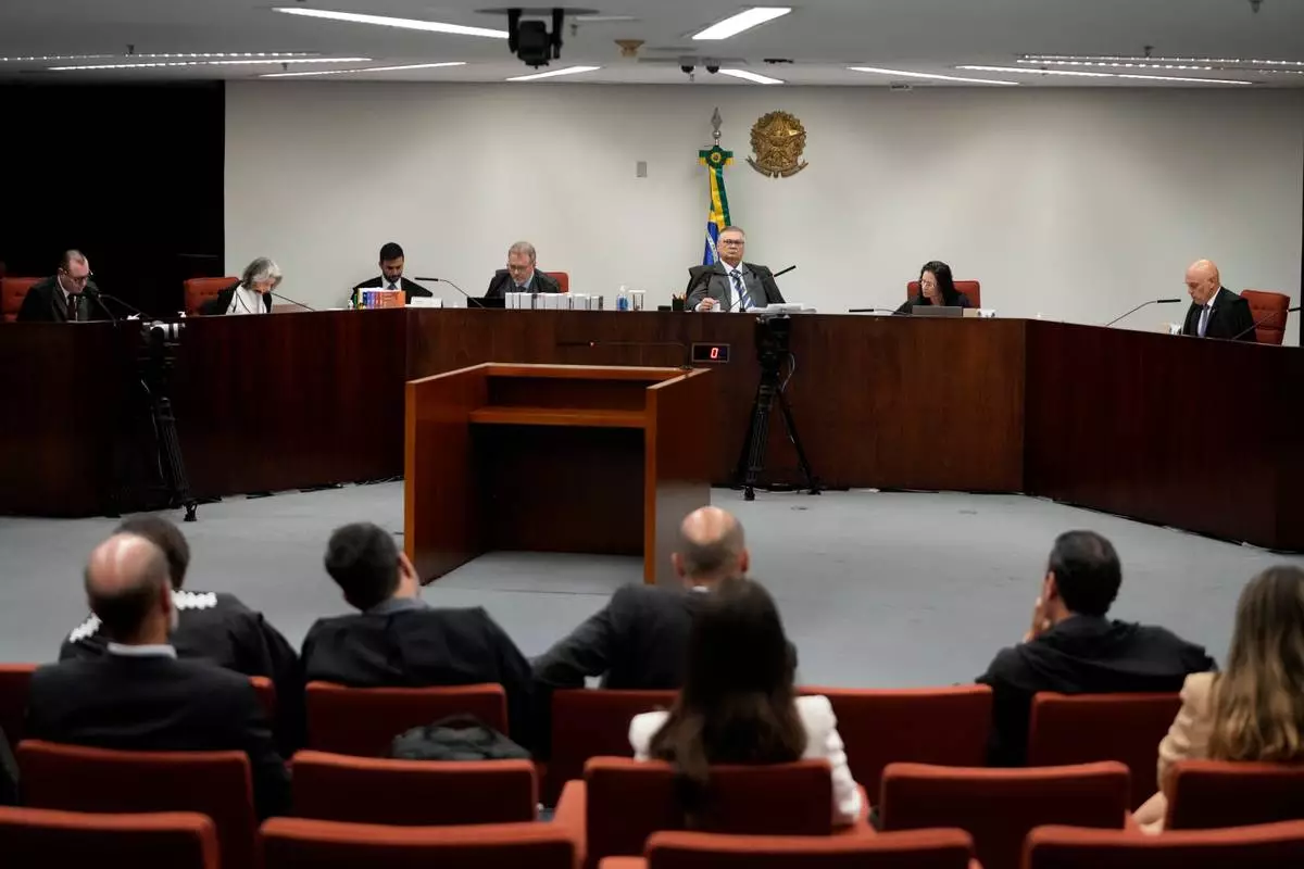 Judge Flavio Dino, center top, presides over the second day of trial of those accused of ordering the murder of councilwoman Marielle Franco at the Supreme Court in Brasilia, Brazil, Wednesday, Feb. 25, 2026. (AP Photo/Eraldo Peres)