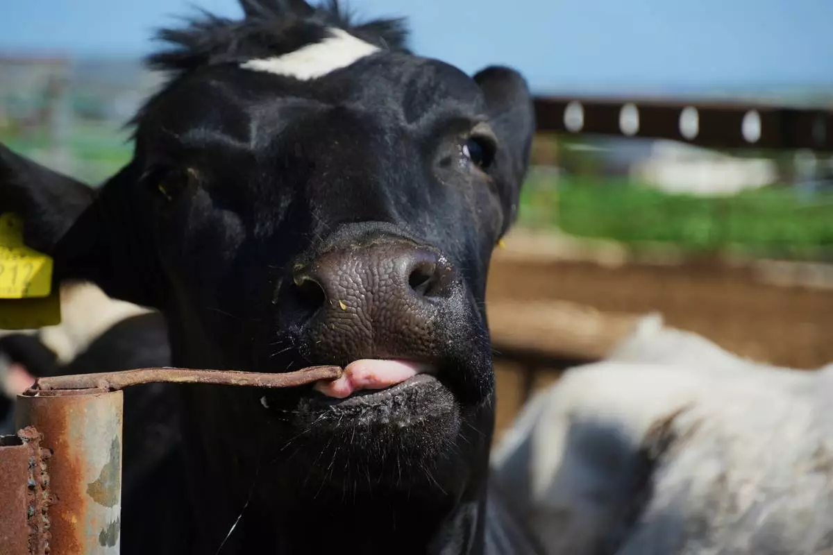 A cow stands in a livestock containment zone holding thousands of goats, sheep, and cattle after an outbreak of foot-and-mouth disease in Kelia, near Larnaca, Cyprus, on Wednesday, Feb. 25, 2026. (AP Photo/Petros Karadjias)