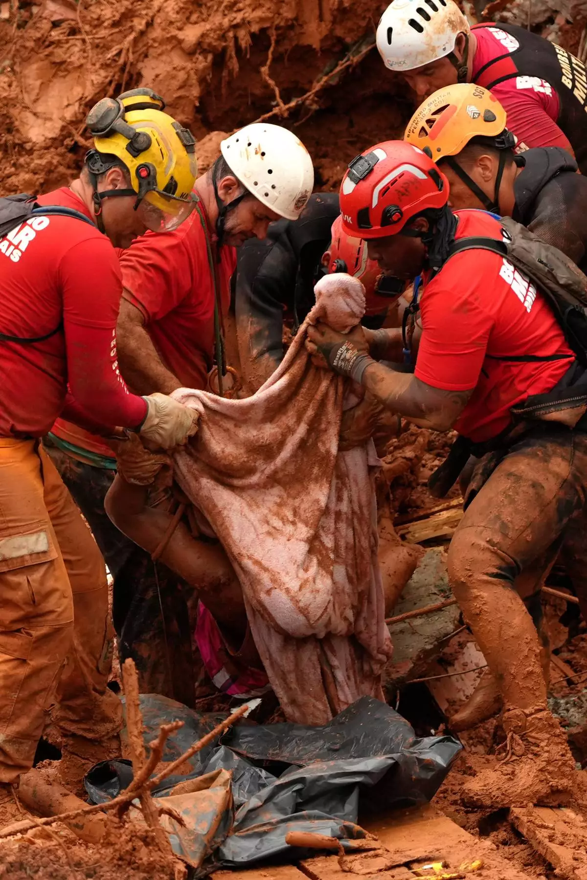 FILE - Firefighters recover a body from the site where homes collapsed during heavy rains and severe flooding in the Parque Burnier neighborhood of Juiz de Fora, Minas Gerais state, Brazil, Feb. 24, 2026. (AP Photo/Silvia Izquierdo, File)