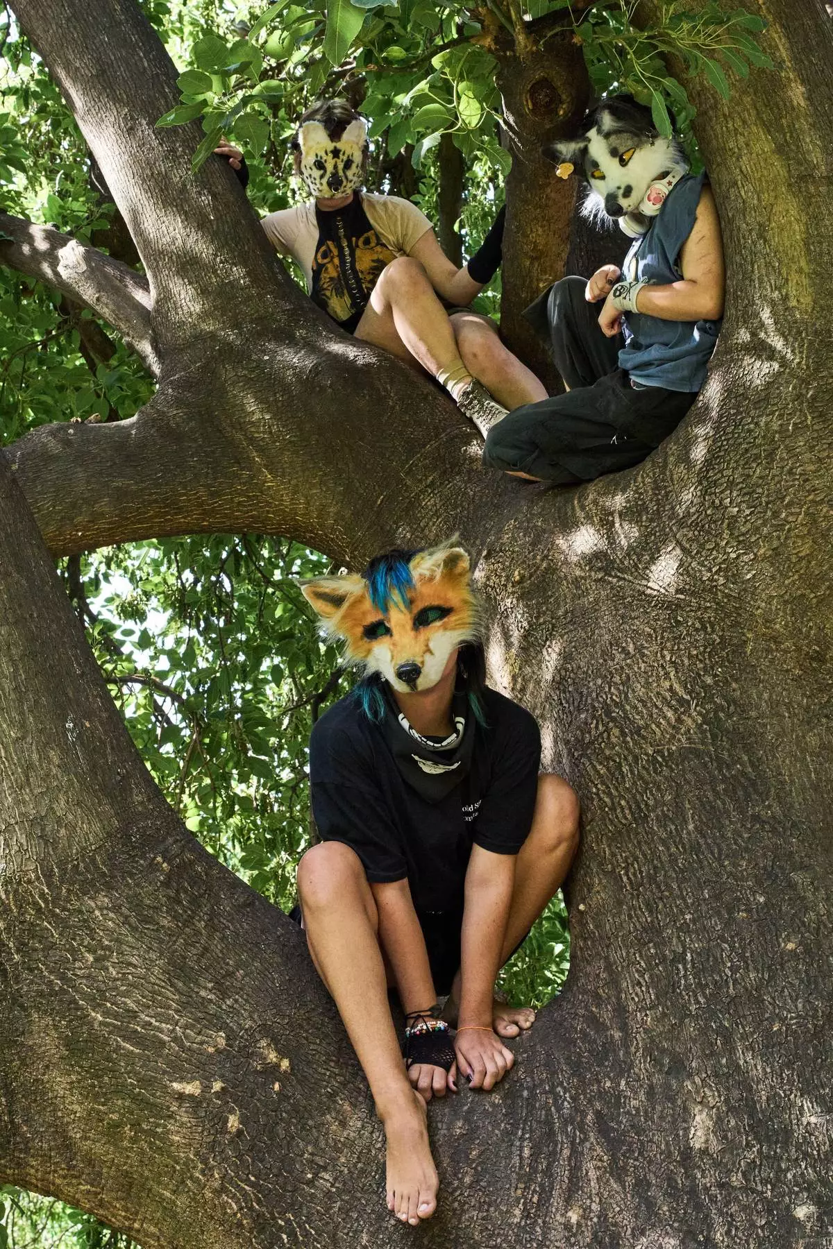 FILE - Youths climb a tree during a gathering of therians, people who say they identify as non-human animals, in Buenos Aires, Argentina, Feb. 22, 2026. (AP Photo/Rodrigo Abd, File)