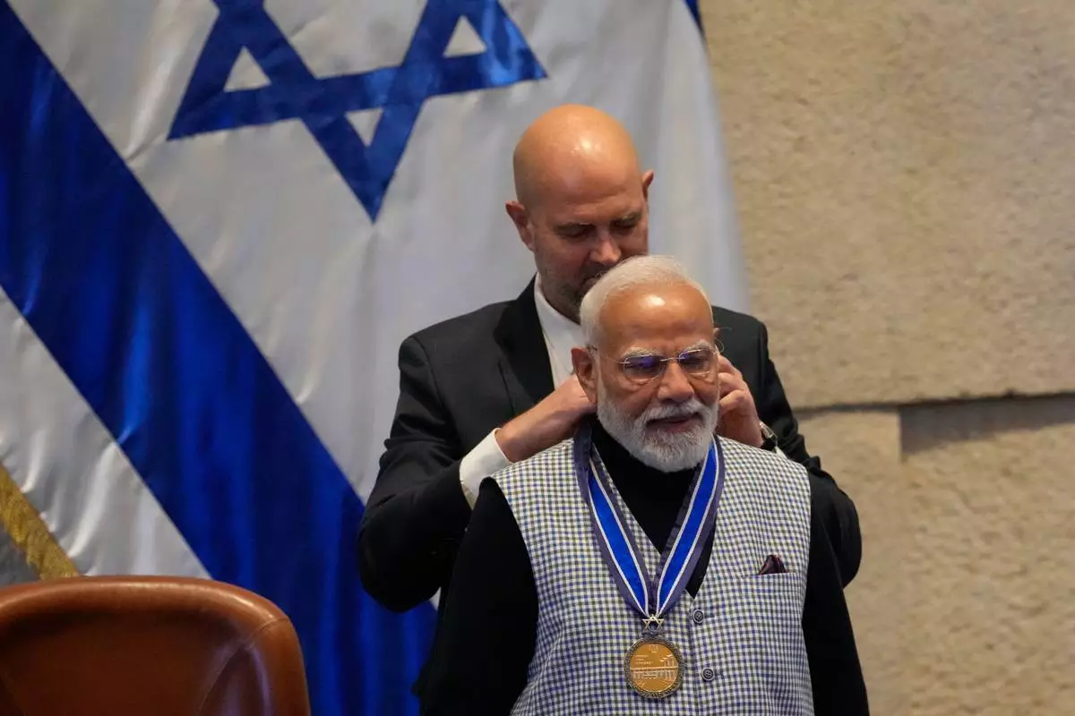 The Knesset building in Jerusalem had been illuminated in the colors of India's flag on the eve of Modi's arrival. Following his speech to lawmakers, Modi was awarded a medal by Speaker Amir Ohana, who said it recognized Modi's leadership in strengthening relations between India and Israel.