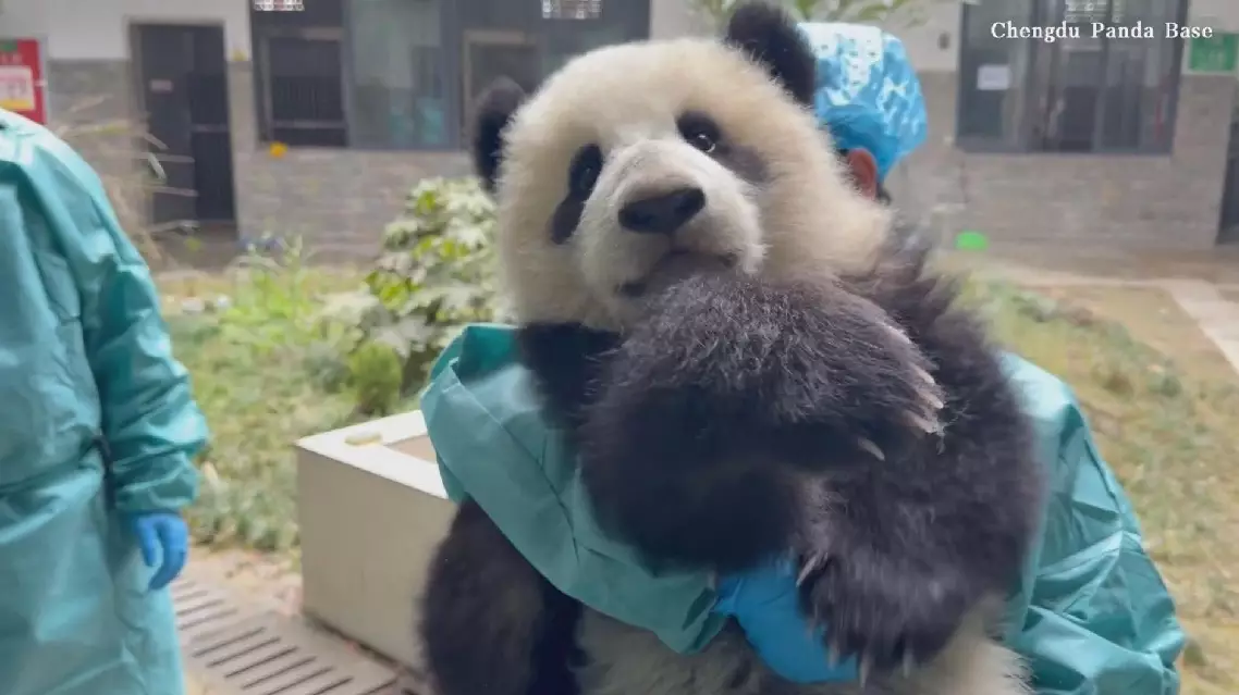 In video footage shot recently at the Star Giant Panda Nursery House at the base in Chengdu City, southwest China's Sichuan Province, energetic panda cubs posed for the camera as they squirmed in their keepers' arms.