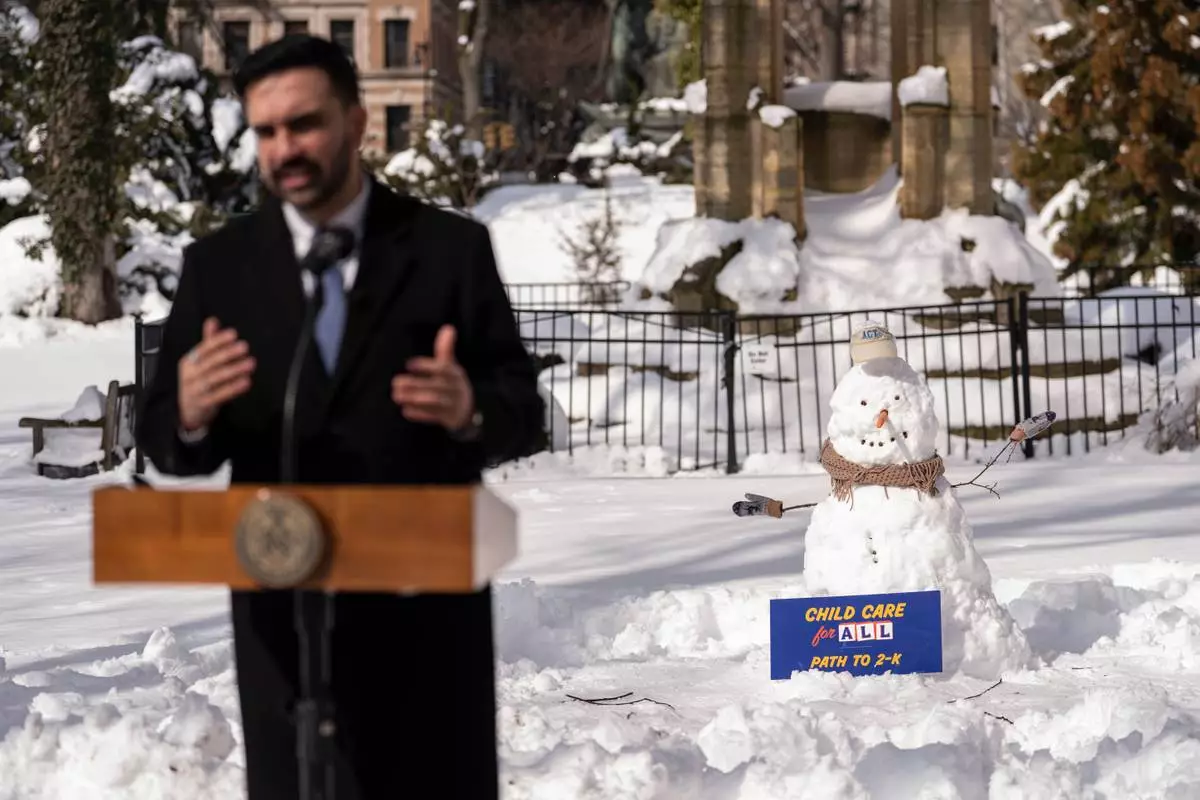 A snowman is seen while New York Mayor Zohran Mamdani speaks during a press conference in Morningside Heights, Wednesday, Feb. 25, 2026, in New York. (AP Photo/Yuki Iwamura)