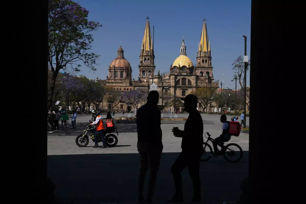 People mill about in the plaza of the Cathedral of the Assumption of Our Lady in the center of Guadalajara, Mexico, Wednesday, Feb. 25, 2026. (AP Photo/Marco Ugarte