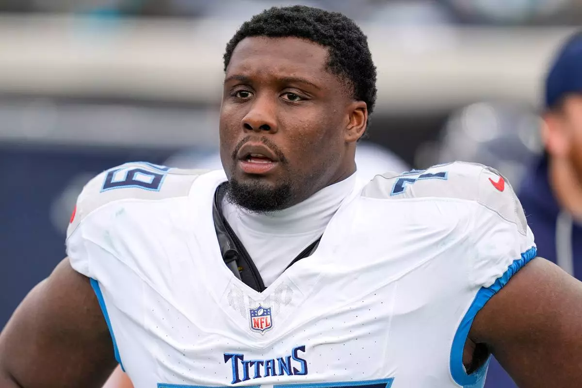 FILE - Tennessee Titans center Lloyd Cushenberry III on the sideline berfore an NFL football game against the Jacksonville Jaguars, Jan. 4, 2026, in Jacksonville, Fla. (AP Photo/John Raoux, File)