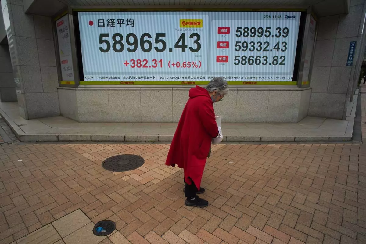A person stands in front of an electronic stock board showing Japan's Nikkei index at a securities firm Thursday, Feb. 26, 2026, in Tokyo. (AP Photo/Eugene Hoshiko)