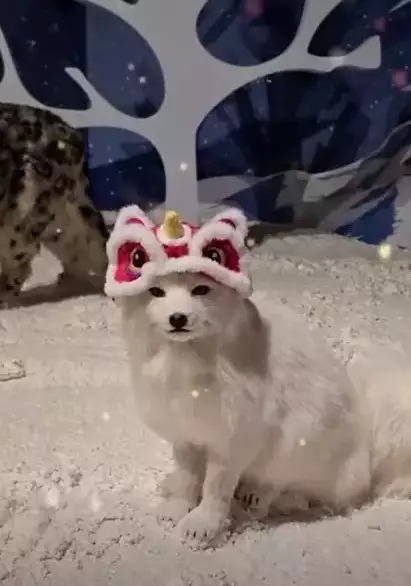 The arctic fox statue wears a vibrant red and white lion dance headdress. Photo source: FB image