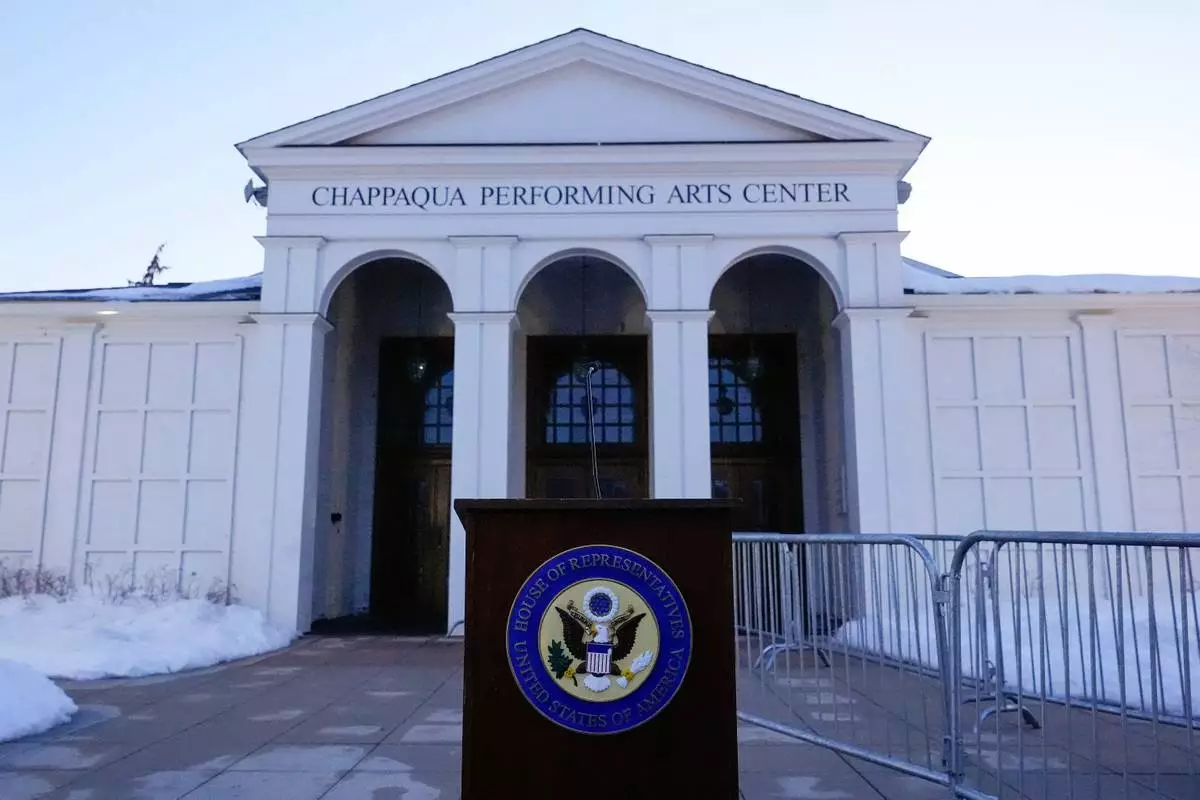A podium sits outside the Chappaqua Performing Arts Center before the arrival of former Secretary of State Hillary Clinton who is testifying before U.S. House lawmakers as part of a congressional investigation into convicted sex offender Jeffrey Epstein, Thursday, Feb. 26, 2026, in Chappaqua, N.Y. (AP Photo/Yuki Iwamura)