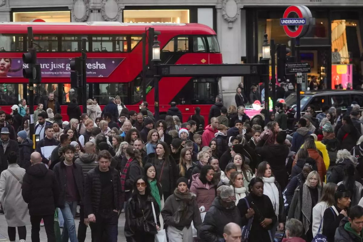 FILE - Shoppers walk along London's most famous shopping Street, Oxford Street, ahead of Christmas in London, Monday, Dec. 22, 2025. (AP Photo/Kin Cheung, File)