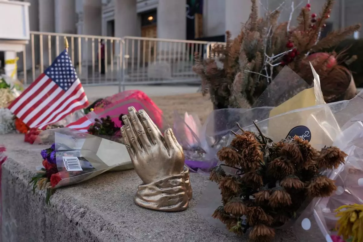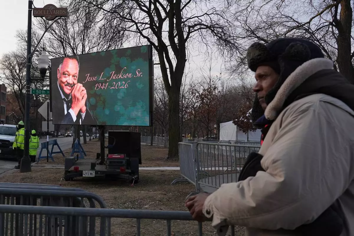 Family members wiped away tears as the casket was brought into the stately brick building. Flowers lined the sidewalks where people waiting to enter watched a large video screen playing excerpts of Jackson's notable speeches. Inside, Jackson's children, Chicago Mayor Brandon Johnson and the Rev. Al Sharpton were among those who stood by the open casket to shake hands and hug those coming to view the body of Jackson, dressed in a suit and blue shirt and tie.