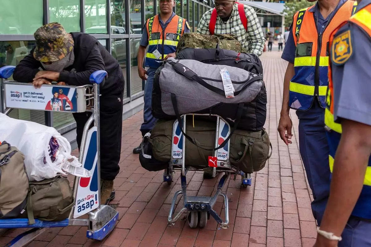 South African men who were allegedly tricked into fighting for Russia in the war in Ukraine arrive at King Shaka International Airport in Durban, South Africa, Wednesday, Feb. 25, 2026. (AP Photo/Str)