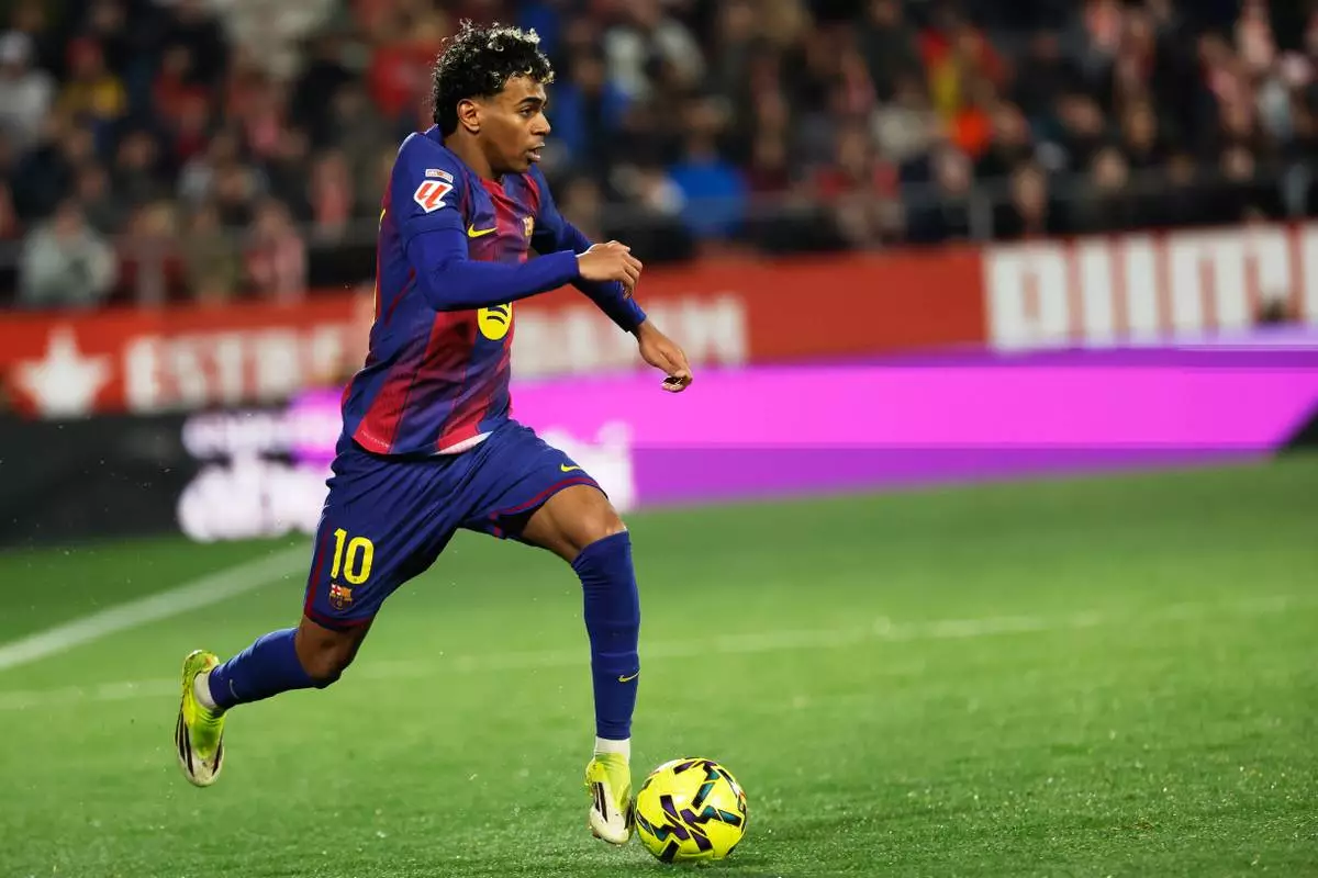 Barcelona's Lamine Yamal runs with the ball during a Spanish La Liga soccer match between Girona and Barcelona in Girona, Spain, Monday, Feb. 16, 2026. (AP Photo/Joan Monfort)