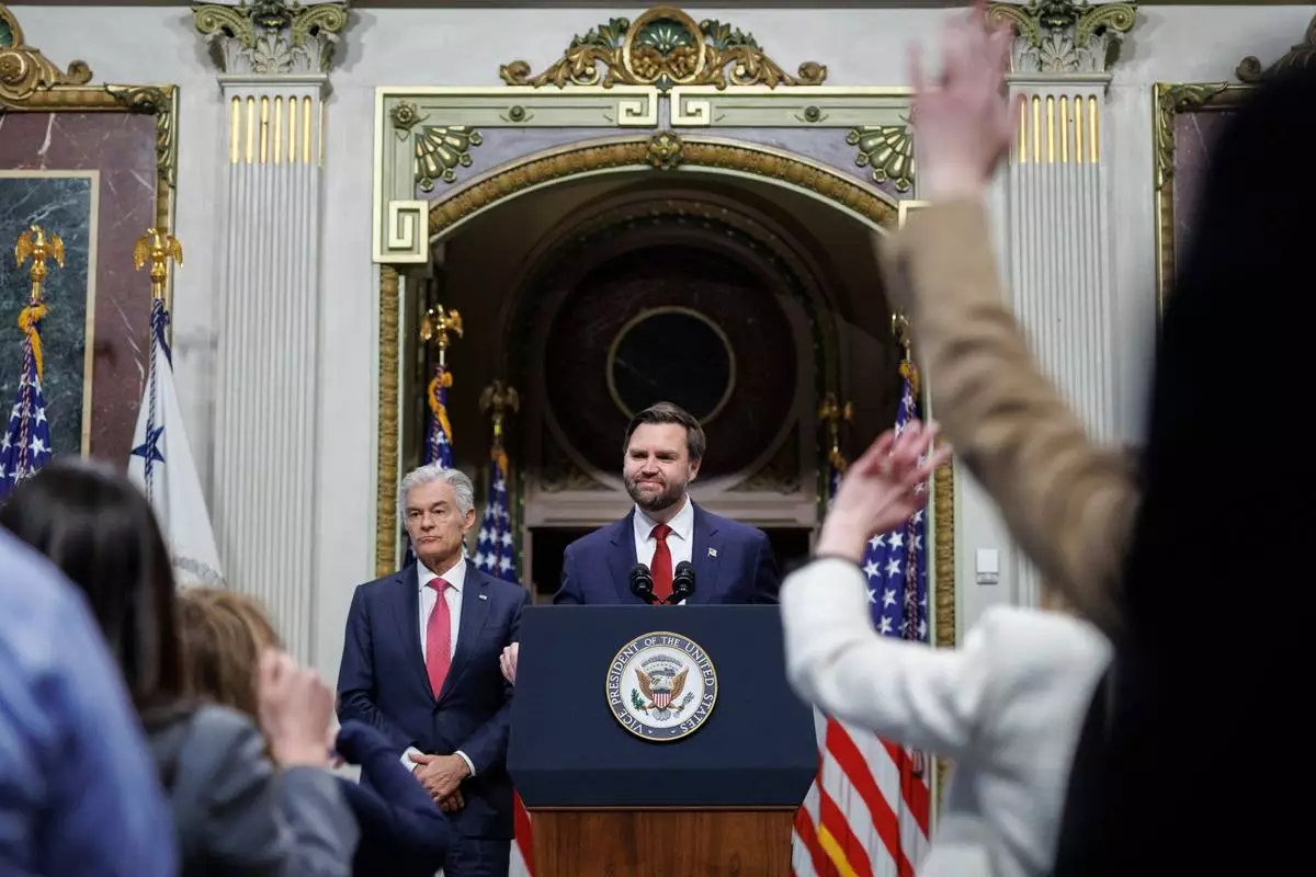 Vice President JD Vance and Administrator for the Centers for Medicare & Medicaid Services Dr. Mehmet Oz take questions from reporters following remarks on the administration's efforts to combat fraud during a news conference in the Old Eisenhower Executive Office Building on the White House campus Wednesday, Feb. 25, 2026, in Washington. (AP Photo/Tom Brenner)