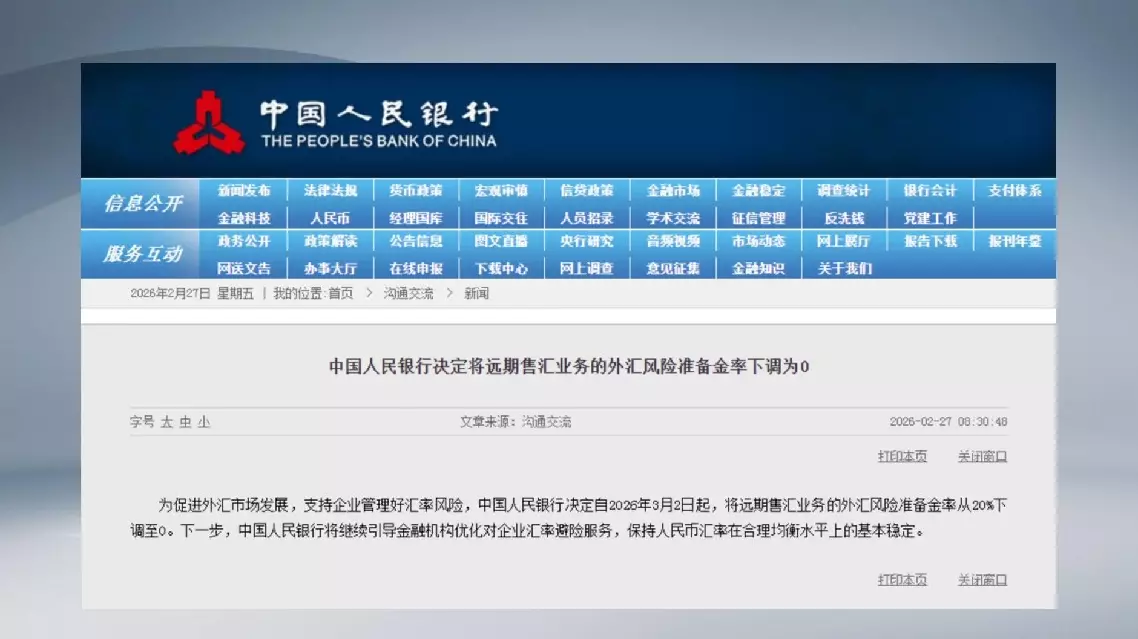 China's central bank announced on Friday that it will cut the foreign exchange (FX) risk reserve ratio for forwards trading to zero, in a move to bolster the development of the foreign exchange market.