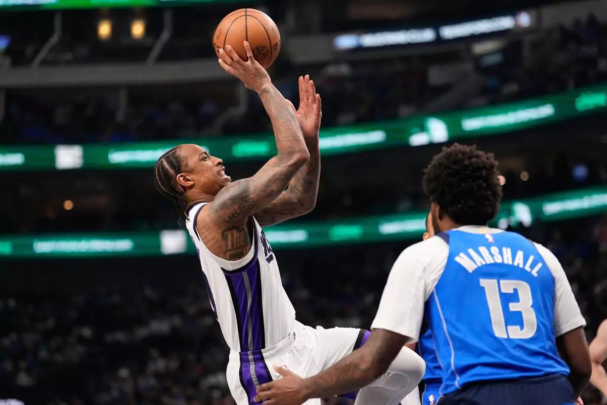 Sacramento Kings guard DeMar DeRozan (10) shoots as Dallas Mavericks' Naji Marshall (13) defends in the first half of an NBA basketball game in Dallas, Thursday, Feb. 26, 2026. (AP Photo/Tony Gutierrez)