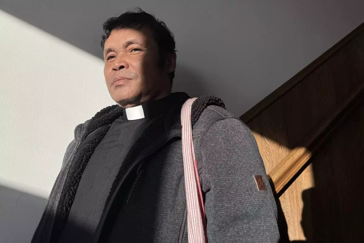 Saw Ba Mya James, an ethnic Karen refugee from Myanmar, stands for a portrait in St. Paul, Minn., on Jan. 28, 2026. (AP Photo/Jack Brook)