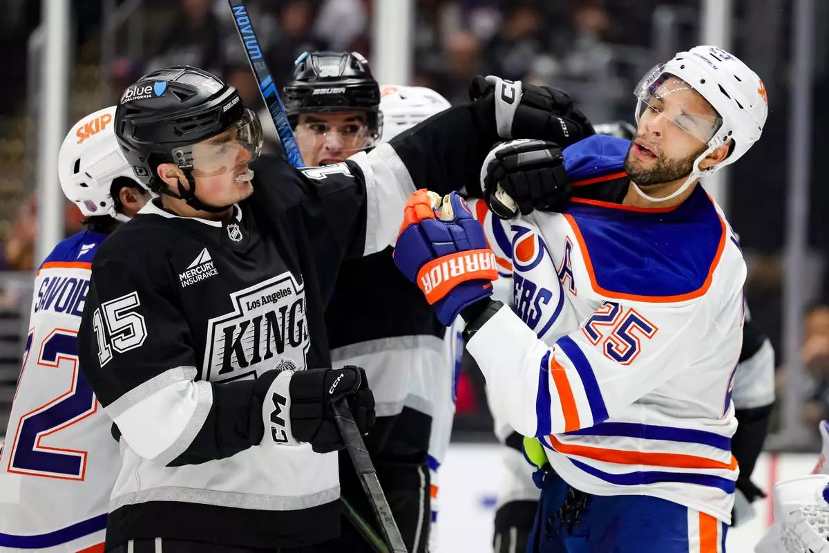Los Angeles Kings center Alex Turcotte, left, and Edmonton Oilers defenseman Darnell Nurse fight during the second period of an NHL hockey game Thursday, Feb. 26, 2026 in Los Angeles. (AP Photo/Ryan Sun)