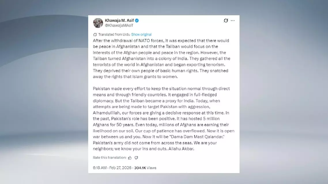 Pakistani Defense Minister Khawaja Asif declared on Friday that Pakistan has run out of patience and is in "open war" with Afghanistan.