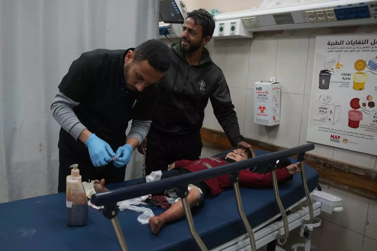 An injured child is treated at Nasser Hospital, following an Israeli military strike in Khan Younis, Gaza Strip, Friday, Feb. 27, 2026. (AP Photo/Abdel Kareem Hana)