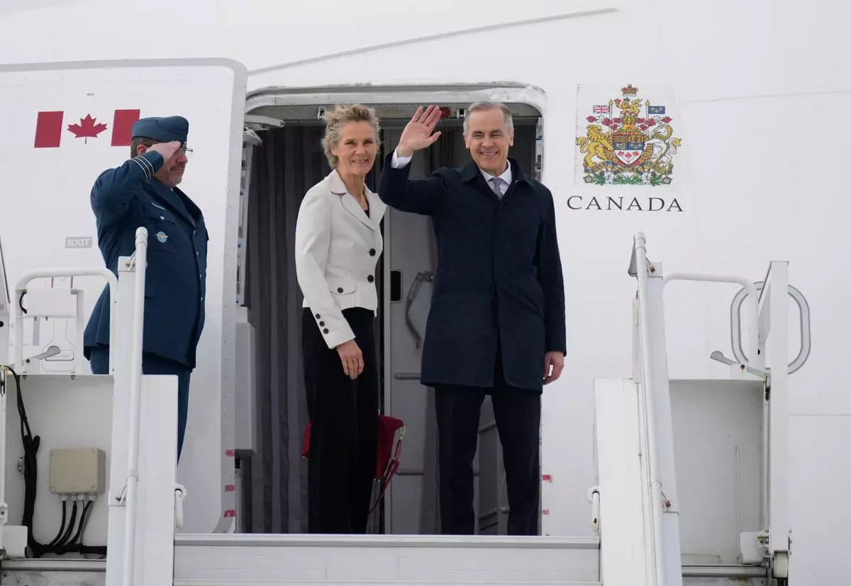 Canadian Prime Minister Mark Carney and his wife Diana Fox Carney board a government plane in Ottawa on Thursday, Feb. 26, 2026. (Adrian Wyld/The Canadian Press via AP)