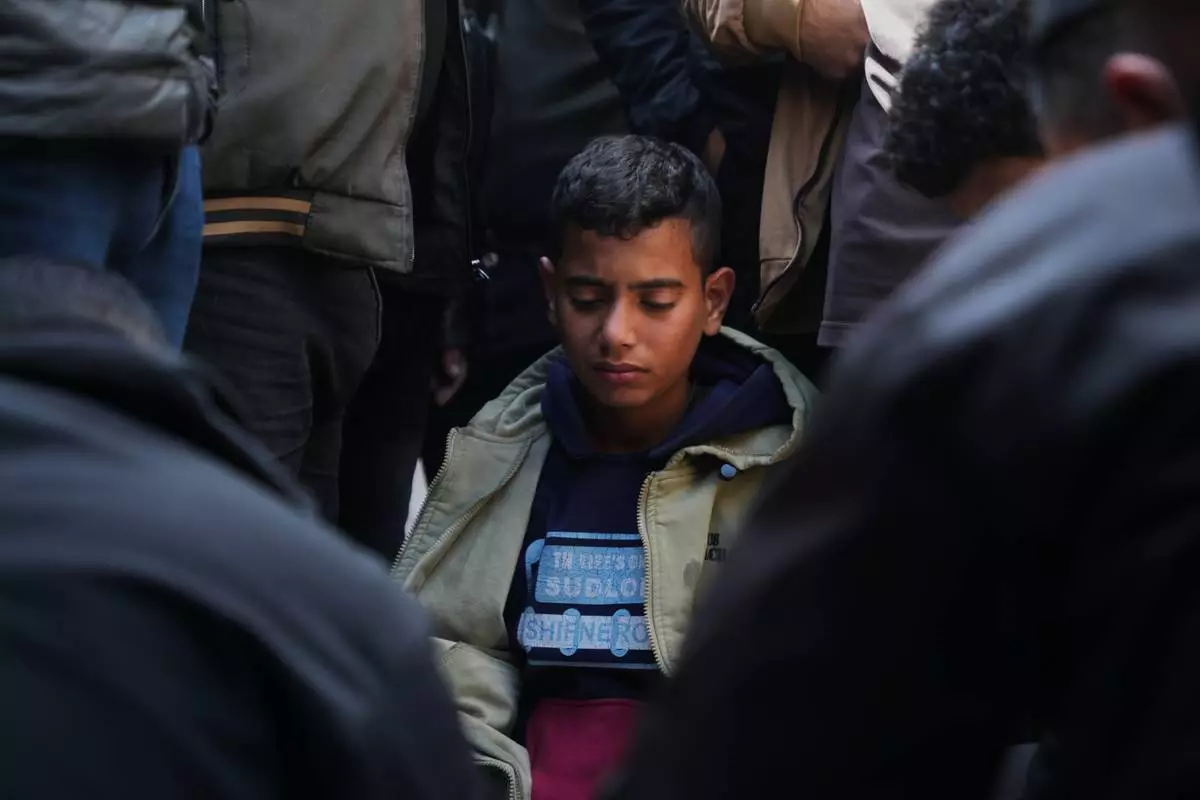 Yazid Al-Zayan, 9, mourns during the funeral of his father Khaled Al-Zayan, a Palestinian policeman, who was killed in an Israeli military strike, in Khan Younis, southern Gaza Strip, Friday, Feb. 27, 2026. (AP Photo/Abdel Kareem Hana)